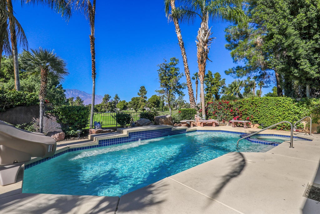 VIEWS! VIEWS! VIEWS! The expansive views of the San Jacinto Mountains are the perfect backdrop to this furnished condominium that is move-in ready. Located at the Rancho Mirage Country Club this property features a private area wall entrance, a double door entry way to a spacious foyer with an open floor plan, a glass mini bar perfect for entertaining, double fireplace to living room and primary bedroom. The primary suite features a sitting area with sliding doors and a view of the green fairway, access to the pool and spa, and a walk-in closet. The private backyard which features a pool and spa is the perfect place to relax and enjoy the beautiful mountain and fairway views. This home is conveniently located near Agua Caliente Casino Resort and Spa, River Mall, Westfield Palm Desert, El Paseo shops, Eisenhower Hospital, and restaurants.