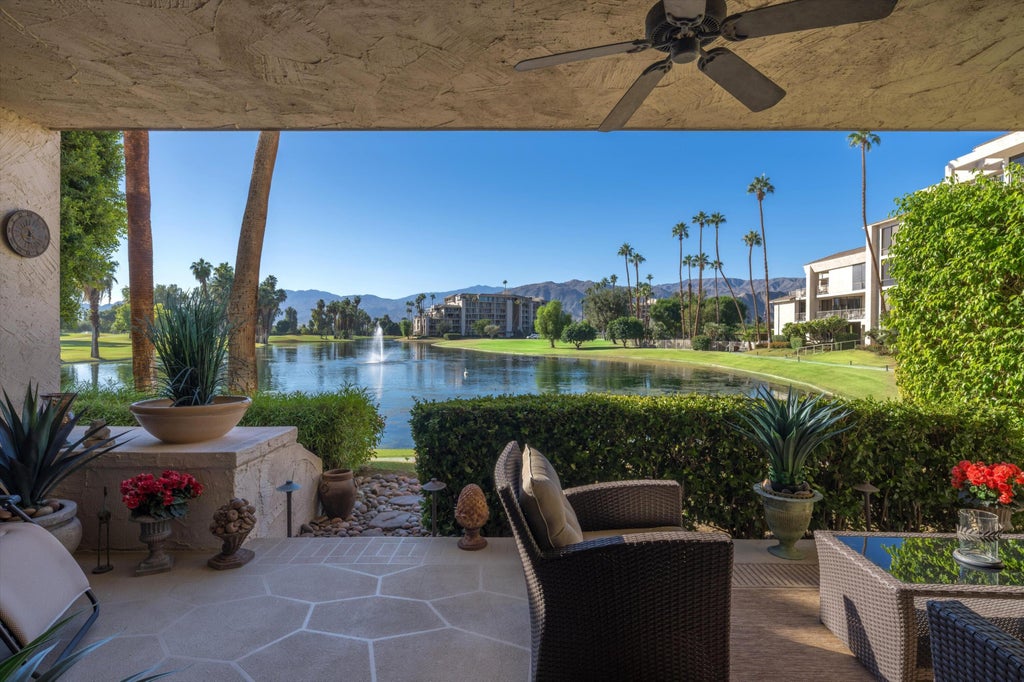 Location..Location..Location! Paradise Found! Enjoy resort-like, carefree living in this remodeled home, offering stunning expansive views from every room. Ideally situated in a southern lakefront location, it provides the best natural lighting and gorgeous, expansive lake and mountain views at any price. Easy access to a spacious covered terrace with stamped concrete flooring and lush green surroundings extends your living space for a true indoor-outdoor lifestyle. The large main bedroom suite is a tranquil retreat with a serene lakefront and gorgeous views. The main bathroom has a large separate tub and shower. The efficient kitchen has beautiful custom cabinetry, solid surface counters, and built-in refrigerator matching cabinetry. Desert Island is a unique high-rise condominium community on a lush green 25-acre island, surrounded by a sparkling lake and an immaculate 18-hole championship golf course. Homeowners enjoy the open park-like grounds with walking paths, fruit trees, benches, tennis and pickleball courts, heated swimming pools and spas, pedal boats, fishing, and 24-hour guard gate entry. HOA monthly dues include most utilities, cable TV, and internet. Buyer to verify square footage.