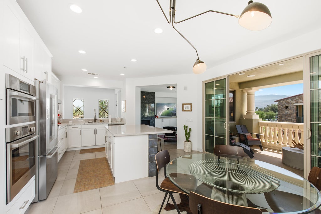 Stunning sun-filled open floor plan with a contemporary flair interior! The design of this Elevated Plan 2 with 2BD+Den/Office end-unit flows freely and dramatically throughout with a focus on indoor and outdoor living/entertainment. The gourmet designed kitchen boasts Quartz counters, recessed lighting, white shaker-style cabinetry, artistic backsplash detail, Bosch stainless steel appliances with a pilotless gas cooktop, island countertop seating and more... this Energy-Efficient home also has Central Air, tankless water heater, fire sprinklers, LED lighting, pre-wired for ceiling fans and multimedia, and a interior laundry. The Living Room has been designed with a gorgeous natural stone fireplace surround, custom-built-ins, and Emser 24x24 tile flooring. This home also has designer wallpaper and custom designed window coverings throughout. The elegant Master Suite is large with patio/deck access and South Mountain Views, a walk-in closet, large shower with designer tile, dual sinks w/hi-quality fixtures, and full-width vanity mirrors. Brava is an inviting prime central Palm Desert location. This gated community of 114 homes offers the lifestyle and sophistication reminiscent of ''Old Tuscany''. Relax at 2 pools/spas, workout in the fitness center, or use the business center at the clubhouse. HOA's include cable/internet landscaping & exterior building maintenance including roof coverage! Located near restaurants, shopping, golf, and entertainment.