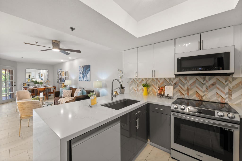 RENOVATED light-filled SINGLE STORY, LOWER UNIT, One Bedroom, Two Bath Condo features a spacious OPEN-CONCEPT living space with a Private Covered Patio which connects you to the natural beauty with a view of a lush green hillside. Located in Fabulous Palm Springs just two short blocks from Downtown with restaurants, shops, nightlife and one block from the Spa Casino! Can be a terrific short-term rental investment (14-day minimum rental policy), seasonal getaway or full-time residence...this unit checks all the boxes! Deauville gated community is sought-after due to its beautifully maintained 9-acre resort-style amenities: 3 pools and spas, fitness center, private clubhouse for events, two tennis courts (one night-lit), reflection pools, shaded underground parking with bike rack, plus stunning mountain views. NEW Tauleto Bianco polished porcelain tile Flooring and 5'' Baseboard throughout. A $13,000 Trane HVAC system was installed in June 2023. Great Room lets in much natural light through the paned doors and includes LEC canned lights, 80'' flat-screen mounted Smart TV and a premium ceiling fan. Enjoy preparing meals in the UPGRADED contemporary kitchen with beautiful quartz countertops, polished marble and brass chevron mosaic tile backsplash, Samsung Bespoke appliances, lots of high-gloss cabinetry, LED light fixture and an eat-in breakfast bar. The large Bedroom includes terrific custom Closet World storage with a slider out to the patio, perfect for entertaining or relaxing. Both Baths have been MODERNIZED with NEWLY installed attractive wall tile and vanities. Additional storage closets are located in the hall and primary bath. Delight in the convenient in-unit stackable washer/dryer. HOA dues include water, garbage removal, exterior grounds, building maintenance and internet. This PALM SPRINGS PARADISE GEM is in a fabulous location and offers an inviting resort-like retreat just for you!