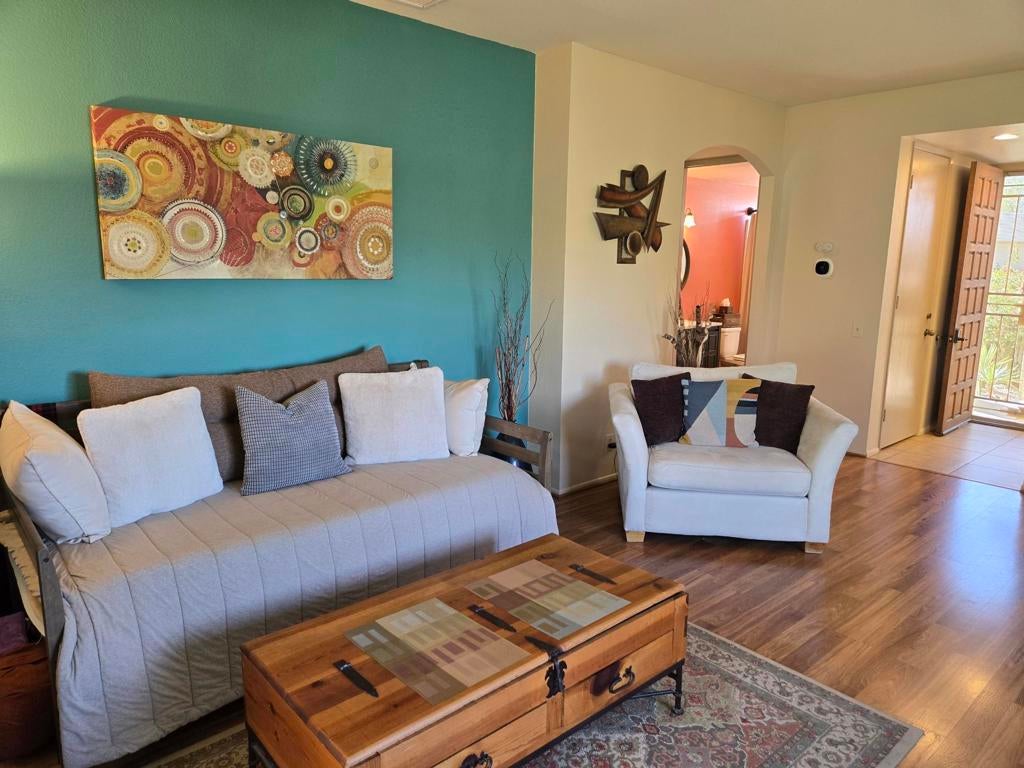 PRICE IMPROVED! Bright, quiet golf course condo with great views and New HVAC and Water Heater. End-Unit Home with Panoramic Mountain Views in Gated Resort Community. Welcome to your dream retreat in this beautifully updated condo featuring 1 bedroom, two full bathrooms, nestled in a gated resort country club community. This light-filled home offers a rare combination of modern upgrades, energy efficient and breathtaking panoramic views of the surrounding mountains from both the front and back patios, perfect for peaceful mornings or unwinding at sunset. This home is perfectly positioned to maximize morning light and afternoon shade on those sunny desert days. Step into a spacious open-concept living room featuring rich wood grain flooring, newly updated recessed lighting, light filtering curtains for energy conservation and added comfort, and fresh custom paint throughout; creating an airy, sophisticated atmosphere. The master suite is a private sanctuary, boasting generous space and brand-new light-filtering curtains matching the living room. Enjoy cooking and entertaining with ease in the open-bar kitchen, while guests will be impressed by the two fully renovated bathrooms showcasing modern finishes and elegant touches throughout. Experience year-round comfort with a high-end, soft start HVAC system conveniently controlled by an integrated EcoBee system with WiFi and Alexa options, and a brand-new top-quality water heater, both designed for whisper-quiet performance and maximum energy efficiency. Additional features include: Detached one-car garage Custom-painted interior Sold unfurnished for you to personalize Easy gate access for convenience and securityLand Lease extended to 2069. Monthly ground rent is $149.68. HOA dues include: 2 DVR or HD cable boxes and service, high-speed internet, grounds maintained to your door by HOA maintenance crews, outside pest control when requested, and outside water. Gated community with 24-hour guarded gate access and regular patrols for added safety and security, health and fitness center membership, tennis, bocce ball, and pickleball courts. Discounts and preferred tee-times for owners at the Desert Princess 27-hole PGA Championship golf course, no initiation fees, rated among the best in the valley by Golf Digest. Don't miss the opportunity to live in luxury with every modern comfort at your fingertips. Sold unfurnished for you to personalize-furniture is negotiable.