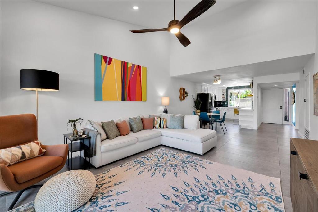 Newly remodeled with modern updates and solar panels for energy efficiency! This bright and inviting condo features Samsung kitchen appliances and beautiful uniform tile flooring throughout. The spacious front courtyard and large rear patio are perfect for relaxing or entertaining. Enjoy being just feet away from the sparkling swimmers' pool!Inside, the thoughtful floor plan offers excellent bedroom separation. The owner's suite and living room both showcase majestic mountain views, while both bedrooms have sliding doors that open to private patios, bringing the outdoors in.Located in the sought-after gated Sunrise Racquet Club, an active tennis community on fee land (land you own!). Community amenities include a clubhouse, racquetball courts, tennis courts, pickleball courts, multiple pools and spas, and beautifully landscaped grounds with tranquil ponds.This low-density, serene community is ideally situated close to downtown Palm Springs, shopping, restaurants, nightlife, the casino, the airport, and the iconic Palm Springs Aerial Tramway. Don't miss this move-in ready, energy-efficient desert retreat!