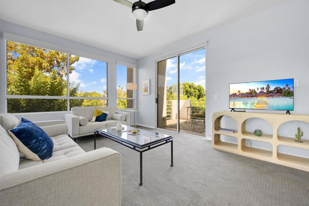 Where modern style meets unmatched value, this turnkey 2-bedroom, 2-bath La Palme condo delivers the ultimate Palm Springs lifestyle. This upper-level end unit offers the perfect blend of modern comfort, convenience, and resort-style living. An open-concept floor plan offers a bright living and dining area filled with natural light from expansive windows and sliding glass doors. Relax on your private balcony and enjoy the serene treetop and mountain views. The remodeled kitchen features white cabinetry, quartz counters, stainless steel appliances, designer custom backsplash and wood-look flooring. The primary suite includes direct access to the balcony, an ensuite bathroom with dual vanities, a skylit bath and walk-in shower. Also impressive, the guest room provides flexibility for visitors or a home office with its own full bath. You'll love the in-unit stackable washer and dryer, updated lighting and fixtures, neutral finishes throughout, and ceiling fans for year-round comfort. The gated La Palme community is a non-smoking community and offers lush landscaping and walking paths, six sparkling pools, six spas, and three tennis courts. The HOA includes basic cable with HBO, WiFi, water, trash, roof maintenance and access to two electric car charging stations. Located just minutes from downtown Palm Springs, shopping, dining, golf and the Palm Springs International Airport. Don't miss the opportunity to experience Palm Springs living at its finest - stylish, convenient, and move-in ready!