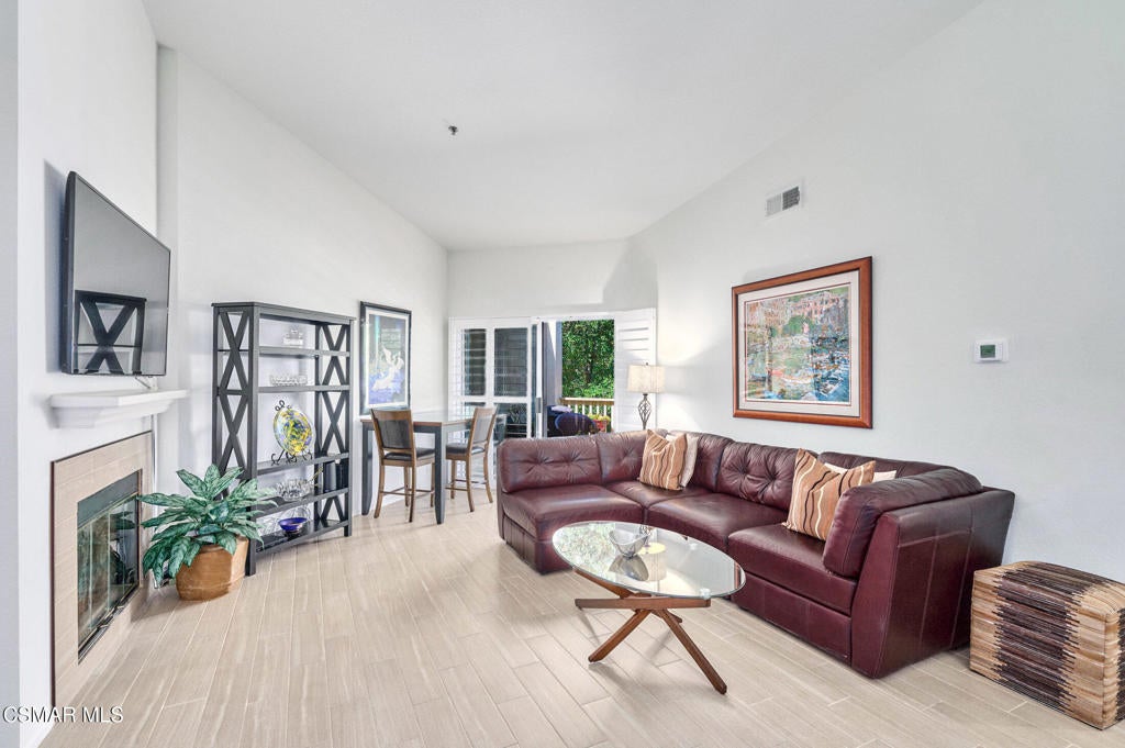 This spacious 1-story condominium, top-floor home offers over 1,100 sq. ft. of sophisticated living space. This private, rear-facing unit features gorgeous mountain and woodland views from not one, but two private balconies overlooking serene landscape and natural surroundings that make Oak Park so desirable. You enter a main living area with soaring vaulted ceilings and an abundance of natural light. The open-concept living room features a cozy fireplace and flows seamlessly into the dining area. An updated kitchen boasts newer appliances with everything a home cook needs within easy reach. All bathrooms are full-sized and the primary suite includes its own en suite bathroom, as a well-sized walk-in closet, plus a private balcony overlooking serene natural landscape. Attractive wood-like ceramic plank flooring offers great style with low maintenance. Additional conveniences include a new HVAC system plus in-unit laundry with newer washer, dryer and water heater. Shadow Ridge offers offers resort-style amenities, including a heated pool and spa, sauna, fitness center, racquetball courts, pickleball, tennis and basketball courts, a comfortable clubhouse and miles of nearby hiking trails and parkland. HOA dues include high-speed Internet, Wi-Fi, and CATV with HBO. (an estimated $200 monthly value). Top-rated Oak Park schools and Oak Park Library are just down the road, plus you're within close proximity to excellent dining, shops and services. Enjoy easy access to the 101 Freeway. Do not miss this opportunity to own an absolute turn-key, condominium home in one of Ventura County's premier communities.