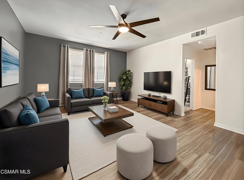 Located in the highly desirable River Village community--one of the few warrantable townhouse developments in the Santa Clarita Valley, Also the best price per square foot in the neighborhood! These units are selling for $780-805k, but this can be yours for $60k less than the market average!This townhouse combines the feel of a standalone home with the convenience of community living. The ground floor features direct access to an attached two-car garage and a private bedroom with its own en-suite bath--perfect for multigenerational living--with access to a private outdoor space.On the main living level, an open-concept great room flows into the upgraded kitchen with granite island, Energy STAR appliances, and custom cabinetry. Natural light fills the space, complemented by recessed lighting and ceiling fans throughout. This floor also includes a bedroom, full bathroom, and a covered deck for year-round enjoyment.The top level is highlighted by a spacious primary suite with dual sinks, soaking tub, separate shower, and a walk-in closet. Two additional bedrooms share a convenient jack-and-jill bath, while the laundry room is located on the same floor for easy access.Built in 2016 by Beazer Homes, this residence comes with a tankless water heater, washer, dryer, and refrigerator, plus the assurance of Energy STAR certification.River Village offers resort-style amenities including a pool, spa, and playground--all in a secure, gated setting close to shopping, dining, and freeway access.Some images have been digitally enhanced.