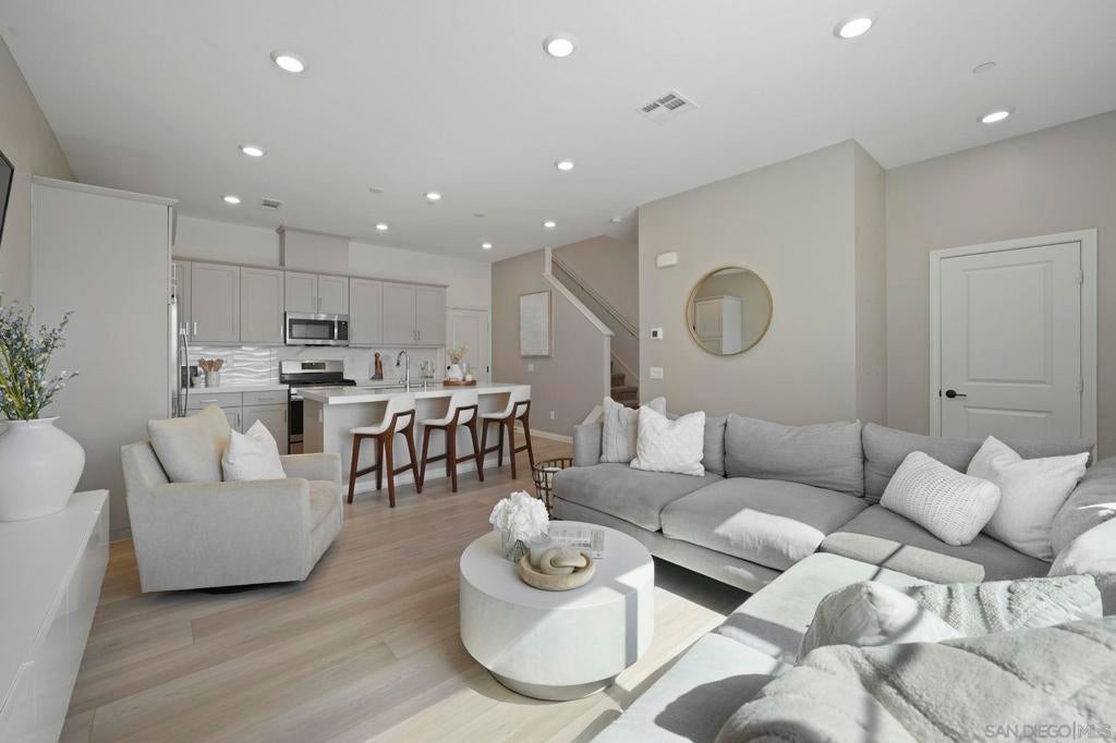 Nearly new 3 bedroom, 2.5 bath townhome in the sought after Bluestone community at Côta?Vera. This home features upgraded luxury vinyl plank flooring, an open concept living and dining area, and a modern kitchen with quartz countertops, stainless steel appliances, and ample cabinet space. The primary suite includes a spa like bath with dual sinks and walk in closet. Additional highlights include a 2 car garage, in unit laundry, and fully paid off solar panels, providing energy savings from day one. Located in a vibrant master planned neighborhood, residents enjoy resort style amenities including a pool, parks, walking paths, and green spaces. Close to newer construction homes, shopping, dining, and top rated schools, this townhome combines modern finishes, sustainable energy features, and functional design. A rare opportunity to own a nearly new home with no solar payments, blending comfort, style, and efficiency in a highly desirable Southern California community.