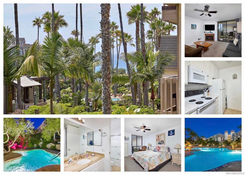Escape to your own beachside retreat with garden and peek ocean views at oceanfront North Coast Village! This resort-like community, with direct beach access, is surrounded by lush tropical landscaping, waterfalls, and a Koi pond. Enjoy access to two heated pools and spas, a putting green, and an ocean-view BBQ area—perfect for soaking up the coastal vibes. Also included are reserved garage parking, a fully equipped gym, relaxing saunas, and the peace of mind of 24-hour gated and guarded security. Sold furnished! North Coast Village is located between the Oceanside Pier and the Harbor. You are 35 miles from the San Diego Airport, and 1.2 miles from the Oceanside Train Station. Just steps from the sand, the locale is perfect for romantic walks along one of Southern California's most beautiful beaches. Amenities include reserved garage parking, cable TV, a recreation center, clubhouse with kitchen, massive stone fireplace, cedar walls, and laundry facilities. Located between Oceanside Harbor and Oceanside Pier, it’s a great area for biking, with a scenic trail starting right across the street and historic Pacific Coast Highway nearby. Enjoy spectacular sunsets, dining along the picturesque Oceanside Harbor with live music and unique shopping. Kayak, boat, and paddle boat rentals, fishing and whale watching excursions are also available. Downtown Oceanside boasts new renovations, exciting restaurants, and hotels.The Main Street Oceanside Farmers' Market offers fresh produce every Thursday morning, while the Sunset Market provides international food booths and live music on Thursday evenings.