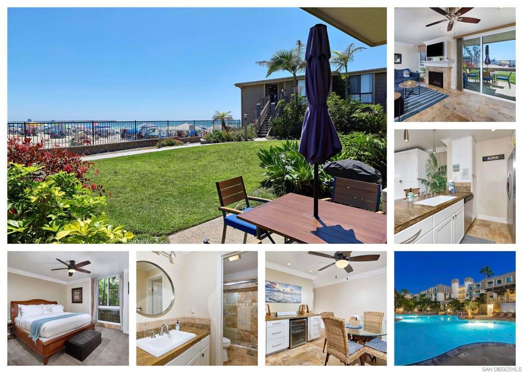 Seller will entertain offers from $1099,888-$1199,888. Experience coastal living at its finest in this stunning beachfront condo, perfectly situated in the highly coveted D Cottage building—just steps from the sand! Enjoy dynamic, front-row whitewater ocean views from your living area and private patio with a grassy yard, the ideal spot to watch the waves roll in. Inside, gorgeous travertine stone floors flow throughout the home, complementing the ocean-view living area complete with a stone fireplace, custom woodwork, and elegant crown molding. The inviting living room is furnished with a plush sectional, along with a convenient wall bed to maximize sleeping capacity. The remodeled kitchen showcases granite countertops, beadboard cabinets, and a designer backsplash, while the spacious bedroom retreat offers custom built-ins and a luxurious travertine stone shower. Beyond the condo, the community feels like a tropical resort, with lush landscaping, streams, and waterfalls. Residents enjoy access to heated pools and spas, a putting green, fitness centers, and saunas—all within a secure, guard-gated complex with reserved parking. North Coast Village features billiards, ping pong, a fitness center with sauna, and a barbecue area overlooking the pool, ideal for gatherings.The complex includes ten four-story buildings and 2-story cottages, all set on beautifully landscaped grounds with streams, waterfalls, and tropical gardens. This oceanfront property is just steps from the sand, perfect for romantic walks along one of Southern California's most beautiful beaches. Amenities include reserved garage parking, cable TV, a recreation center, clubhouse with kitchen, massive stone fireplace, cedar walls, and laundry facilities. Located between Oceanside Harbor and Oceanside Pier, it’s a great area for biking, with a scenic trail starting right across the street and historic Pacific Coast Highway nearby. Enjoy spectacular sunsets, dining along the picturesque harbor, live music, and unique shopping. Kayak, boat, and paddle boat rentals, fishing, and whale watching excursions are also available. Downtown Oceanside boasts new renovations, exciting restaurants, and hotels. The Main Street Oceanside Farmers' Market offers fresh produce every Thursday morning, while the Sunset Market provides international food booths and live music Thursday evenings.