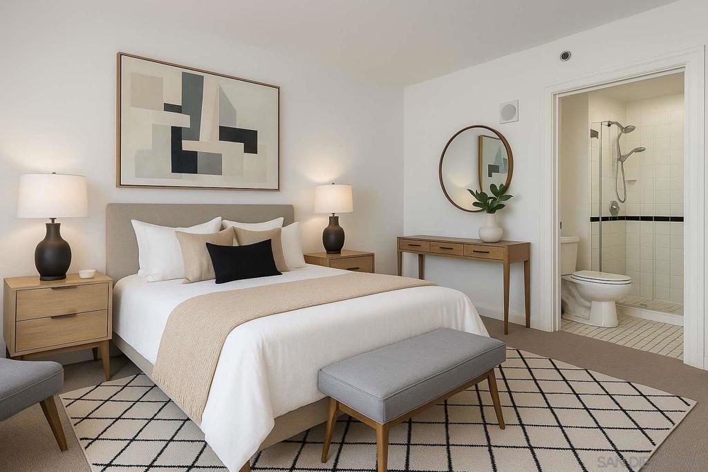 Rare Little Italy two bedroom with City Views! This southwest corner residence has been recently upgraded throughout. Both bathrooms feature custom quartz tile and modern black hardware accents. The spacious open-concept living area offers hardwood floors and access to two private balconies. Dual primary suites include automatic blackout curtains, custom walk-in closets, and brand new carpeting.Additional highlights of this unique condo include two private storage units and two side by side parking spaces. Building amenities feature a rooftop pool, hot tub, fitness center, Amazon package lockers, EV charging stations, 24-hour security, and a front desk attendant.Enjoy the unbeatable walkability to Little Italy’s top-rated restaurants, boutique shops, entertainment venues, and the nationally acclaimed Farmers Market.