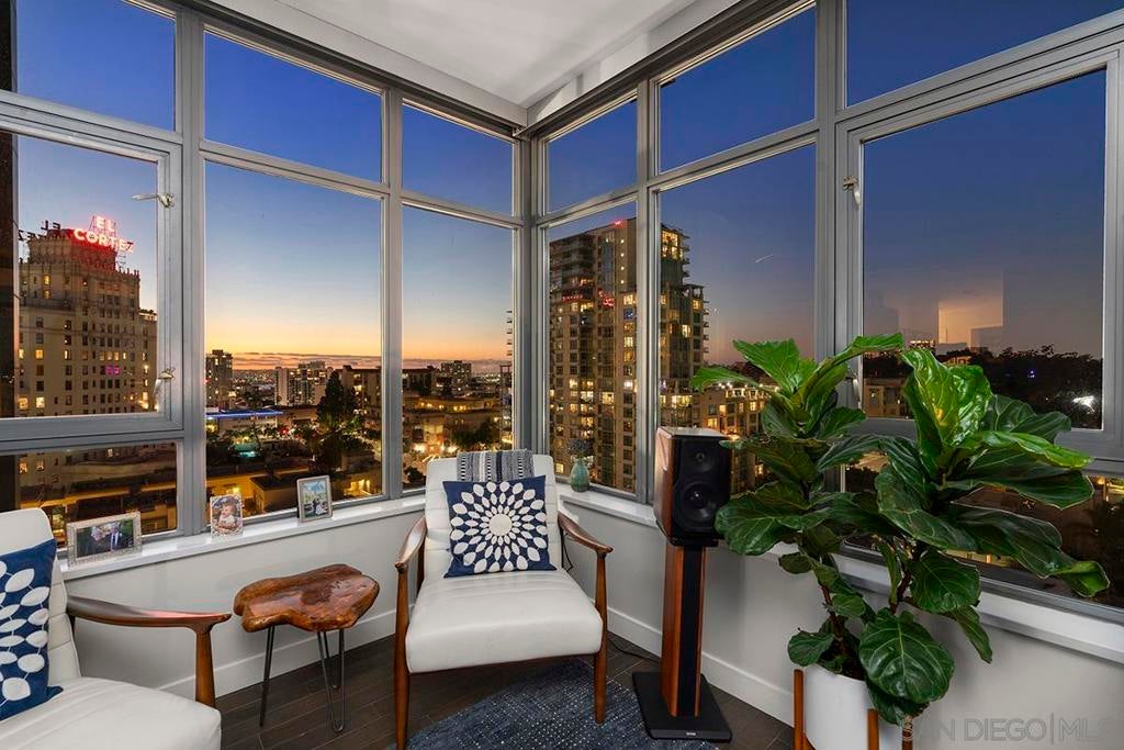 Perched on the 14th floor, this northeast corner residence at Aria impresses with sweeping 270° views of the city skyline, Balboa Park, distant mountains, and even glimpses of the Bay and Coronado Bridge. Enjoy the vibrant Downtown energy from your spacious private balcony—perfect for morning coffee or soaking in peaceful sunrises. Inside, the open living area dazzles with sleek ceramic wood-look tile flooring, floor-to-ceiling windows, motorized shades, and airy 9-foot ceilings that create a seamless blend of comfort and sophistication. The chef-inspired kitchen is a true showpiece, featuring Calacatta quartz countertops with a waterfall edge and backsplash, an extended eat-at bar, Bosch induction cooktop, convection oven with air fryer, dual-drawer dishwasher, instant hot water faucet, and Gallery microwave. A custom-built coffee bar and beverage chiller elevate everyday convenience with a touch of luxury. The primary suite includes blackout shades and a beautifully upgraded ensuite bath with a glass shower enclosure and dual vanity, while the guest bathroom features a custom-built linen cabinet for added storage. Additional highlights include tandem parking and a private storage room conveniently located directly in front of the parking spaces. Set within the sought-after Cortez Hill neighborhood, Aria offers a serene residential feel just moments from Downtown’s finest dining, culture, and entertainment—modern luxury perfectly balanced with urban excitement. Located atop Cortez Hill, the highest point in San Diego, Aria was completed in 2008 and comprises 137 units. This prime location is set away from the city's hustle and bustle, offering both tranquility and convenience. Residents can enjoy a short stroll or drive to Balboa Park and the vibrant offerings of Downtown San Diego, coupled with excellent freeway access for broader travels. Aria residences boast spacious outdoor balconies and terraces, enhancing the living experience with modern comforts and stunning views of the bay, Balboa Park, and the city skyline. The building's amenities include a fitness center, lap pool and spa, club room with a catering kitchen and wet bar, all designed to elevate the quality of life for its residents.