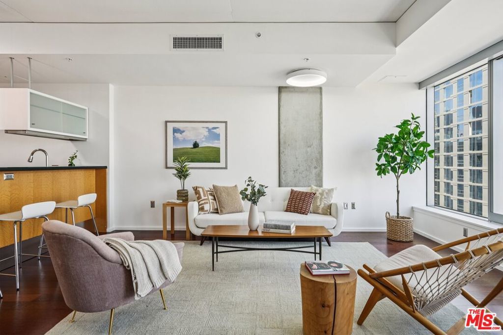 Major price improvement! Priced to sell, don't miss out! Welcome to EVO South, a LEED-certified architectural standout in Downtown LA's vibrant South Park district. Perched on the 12th floor, Unit #1207 is a bright and spacious 1-bedroom, 1-bath residence that blends contemporary comfort with sleek urban style.The open-concept living space is wrapped in floor-to-ceiling windows, flooding the home with natural light and showcasing sweeping skyline views. Soaring ceilings, a striking concrete column, and wide-plank hardwood floors create a gallery-like feel, while the newly styled interiors bring warmth, texture, and balance to the modern design.The gourmet kitchen features custom European cabinetry, stone countertops, stainless steel appliances, and a large breakfast bar that flows seamlessly into the main living area, ideal for casual dining or entertaining. The bedroom offers privacy with a sliding frosted-glass barn door and built-in wardrobe, while the spa-inspired bath is outfitted with designer fixtures, a deep soaking tub, floating vanity, and linen tower.A separate laundry room includes a stacked LG washer/dryer with added shelving and hanging space for everyday functionality. Living at EVO means access to world-class amenities including a rooftop lounge with panoramic views, a 6th-floor terrace with infinity-edge pool, spa, BBQ stations and outdoor bar, plus a fully equipped fitness center. Residents also enjoy secure entry, front desk concierge, and package handling. One assigned parking space is included.Moments from Whole Foods, LA Live, Crypto.com Arena, and Downtown's best dining and shopping. This is city living at its most refined.