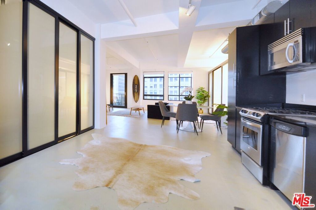 PROPERTY WAS LEASED. Spacious 1200sf LIVE/WORK loft with rare balcony at the iconic Eastern Columbia building. The stunning Art Deco building was designed by Claud Beelman and is a winner of the 2025 LA Conservancy Award and the 2025 Preservation Design Award from the California Preservation Foundation. The building currently benefits from the coveted historic Mills Act contract that offers property owners up to 70% off property taxes. The bright and airy L-shaped loft features beautiful polished concrete floors, tall ceilings, and massive west-facing windows that let in an abundance of natural light. A rare balcony off the living area is perfect for a drink at sunset. A main bedroom area with sliding glass wall creates privacy while another flexible area can be open/enclosed for another bed or office. The open plan kitchen features stainless steel appliances, there is a spacious closet near the entry, and W/ D hookups inside. The Kelly Wearstler designed bathroom features a soaking tub with glass enclosure. 1 covered parking space in the attached garage is included with the unit. HOA Dues include parking, water, trash, gas. Amenities include a stunning rooftop pool, sun deck, spa, and fitness center with breathtaking views of DTLA, designer lobby with a 24/7 reception desk and security, courtyard, dog area, additional laundry facilities and attached parking garage. Within blocks to everything including Whole Foods, Fashion District, Orpheum, Proper and Hoxton hotels, Metro, The Broad, IL Caffe, Mykita, Cliftons, Cabra, Caldo Verde, Zinque, Rosso Blu, Verve, Walt Disney Concert Hall, The Conrad, LA Athletic Club, The Bloc, Fashion District, City Market South, Grand Central Market, and more.