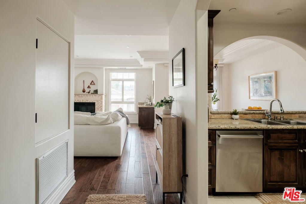Located within the Carpenter Community Charter School District, this home offers elevated living in one of Studio City's most desirable enclaves-- just moments from the charm and vibrancy of Tujunga Village. This exquisite 3-bedroom, 2.5-bath residence is tucked away at the back of the building, well away from Moorpark Street, and combines timeless Mediterranean design with modern luxury. Inside, you're greeted by a light-filled interior with oversized windows and serene south-facing peekaboo hillside views. The open-concept living and dining areas feature elegant crown molding, a tiled gas fireplace with an arched inlay, a wet bar and a tucked-away powder room for guests. Just off the dining area is a private balcony, perfect for al fresco moments. The spacious kitchen is outfitted with sleek stainless steel appliances, abundant cabinetry, and a large cutout breakfast bar. The expansive primary suite is a true retreat, featuring a dressing-room-style closet and a spa-inspired en suite bathroom with dual vanities, a soaking tub, and a separate glass-enclosed shower. The two additional bedrooms are thoughtfully positioned near a full hall bathroom and in-unit laundry is both hidden and convenient. Residents enjoy side-by-side, gated subterranean parking, guest parking, and a shared rooftop deck with panoramic views. HOA allows an electric vehicle charger to be installed and has a strong reserve fund and includes earthquake insurance. This home offers unbeatable proximity to neighborhood favorites including Woodbridge Park, the Studio City Farmers Market, major studios, and the world-class offerings of Ventura Boulevard. With convenient commuter routes nearby, every corner of Los Angeles is within easy reach of this luxury condo.