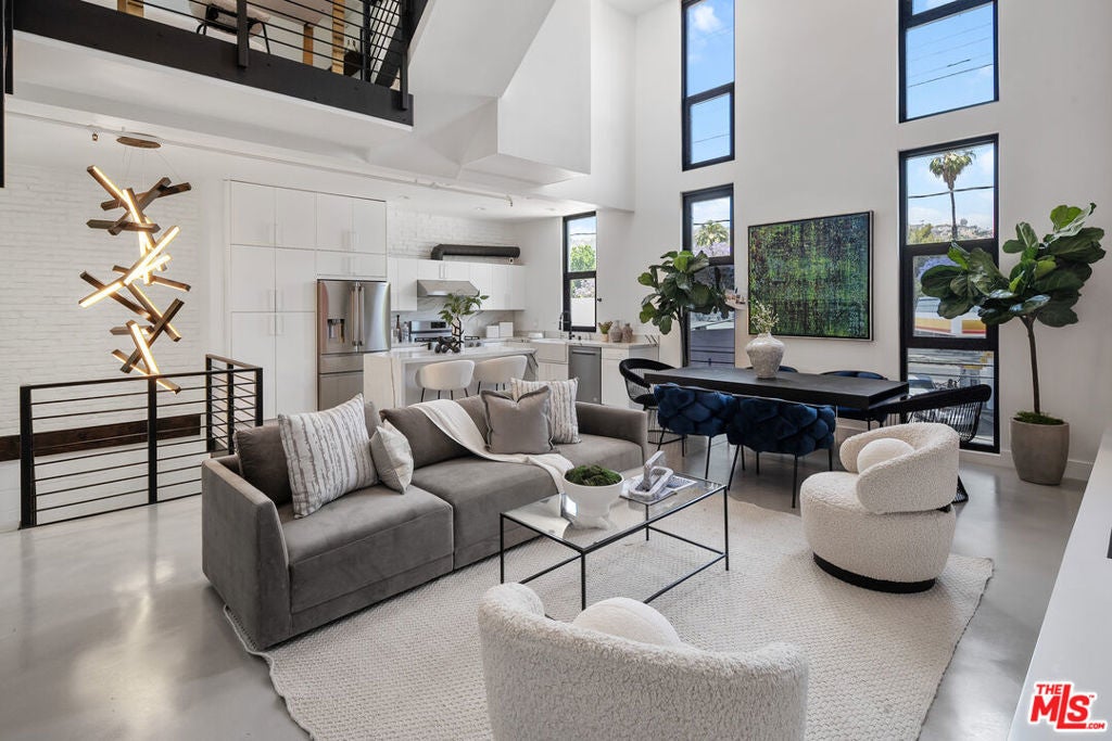 Live above it all in this impeccably designed penthouse condo that lives like a townhouse, nestled in the heart of West Hollywood. Offering over 2100 square feet of thoughtfully curated living space, this three-bedroom, three-bath residence features soaring ceilings, a striking blend of micro cement and wood floors, and elevated finishes throughout. One of the bedrooms on the first level has been converted into a custom walk-in closet but can easily be transformed back, offering flexible use of space to suit your lifestyle. The bright white kitchen is outfitted with newer appliances and opens into an airy living and dining area that flows effortlessly for entertaining or unwinding in style. Step outside to your private outdoor patio with a hot tub and outdoor shower, or ascend to the expansive rooftop deck to enjoy sweeping views from the Hollywood Hills to downtown Los Angeles. Additional highlights include rare guest parking, extra storage, and an unbeatable location near some of the city's most iconic restaurants, nightlife, and entertainment.