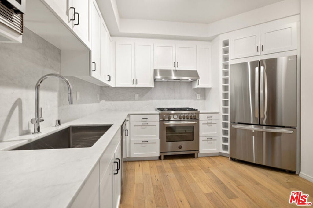 Introducing the Woodbridge a unique collection of 21 contemporary residences in the heart of Studio City with multiple units now available for sale. Exclusive architectural design and high end finishes combine to create a one of a kind space in these completely updated and reimagined luxury condos. Enjoy the exquisite detail and design of these novel floorplans. The sophisticated kitchen offers brand new, never been used, stainless steel appliances including a top of the line stove, built in refrigerator, microwave and wine storage all of which are accented by Carrera marble countertops. White oak hardwood floors seamlessly connect the open space to the living room and fireplace, dining room and private balcony. This chic abode is complete with laundry in unit and two individual parking spots in the gated garage. The Woodbridge offers an elegant and secured lobby, pool, gym and business center and is centrally located to the studios, as well as some of the area's most desirable shopping, dining and nightlife.