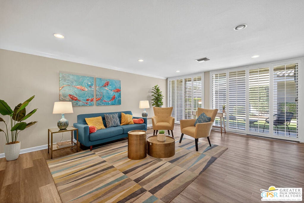 Desert living at its best! This beautifully updated 2-bedroom, 2-bath condo in the desirable Palm Springs Country Club community is move-in ready and full of charm. With gorgeous mountain views, stylish new flooring, and a spacious 1,420 sq ft layout, this home is perfect as a full-time residence, vacation retreat, or income-generating rental. The open-concept living area is filled with natural light and flows seamlessly into the dining space and updated kitchen ideal for entertaining or just relaxing in comfort. The oversized primary suite offers a walk-in closet and an en-suite bath, while the second bedroom is perfect for guests, a home office, or both. Multiple private patios let you enjoy your morning coffee or evening cocktail with the San Jacinto Mountains as your backdrop. Set on fee land (you own it -no lease!), this home also features indoor laundry, a smart floorplan, and access to community amenities including sparkling pools, spas, and lush greenbelts. Just minutes from downtown Palm Springs, restaurants, shops, and the airport, with no rental restrictions, this one checks all the boxes. Stylish, spacious, and sun-soaked don't miss this desert gem!