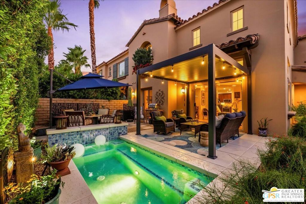 Welcome to your private Mediterranean-inspired retreat in the heart of Palm Springs - perfect as a sophisticated primary residence or a stylish vacation getaway. This elegant home offers 3 spacious bedrooms and 3 bathrooms, blending timeless charm with fresh modern updates. Step inside to soaring ceilings, an inviting fireplace, and an open-concept living space that flows seamlessly into the gourmet kitchen - ideal for both intimate evenings and lively gatherings. The kitchen shines with granite countertops, abundant storage, and brand-new stainless steel appliances including a refrigerator, stove, and dishwasher. Recent upgrades elevate this home's appeal: new carpet, a new HVAC system for year-round comfort, additional LED lighting for a warm, modern glow, and a new louvered patio cover that lets you control shade and sunlight for perfect outdoor enjoyment. Your private backyard oasis is designed for relaxation and entertainment, featuring an app-controlled pool/spa combo, and beautifully refreshed mature landscaping. Upstairs, two generous en-suite bedrooms offer privacy, while the third room is perfect for a home office, media space, or yoga studio. Located in the secure, gated community of Terra Vita, residents enjoy access to a sparkling community pool, spa, and BBQ area - all just minutes from vibrant downtown Palm Springs. This move-in-ready gem combines refined desert living with thoughtful upgradesmaking it the perfect Palm Springs escape.