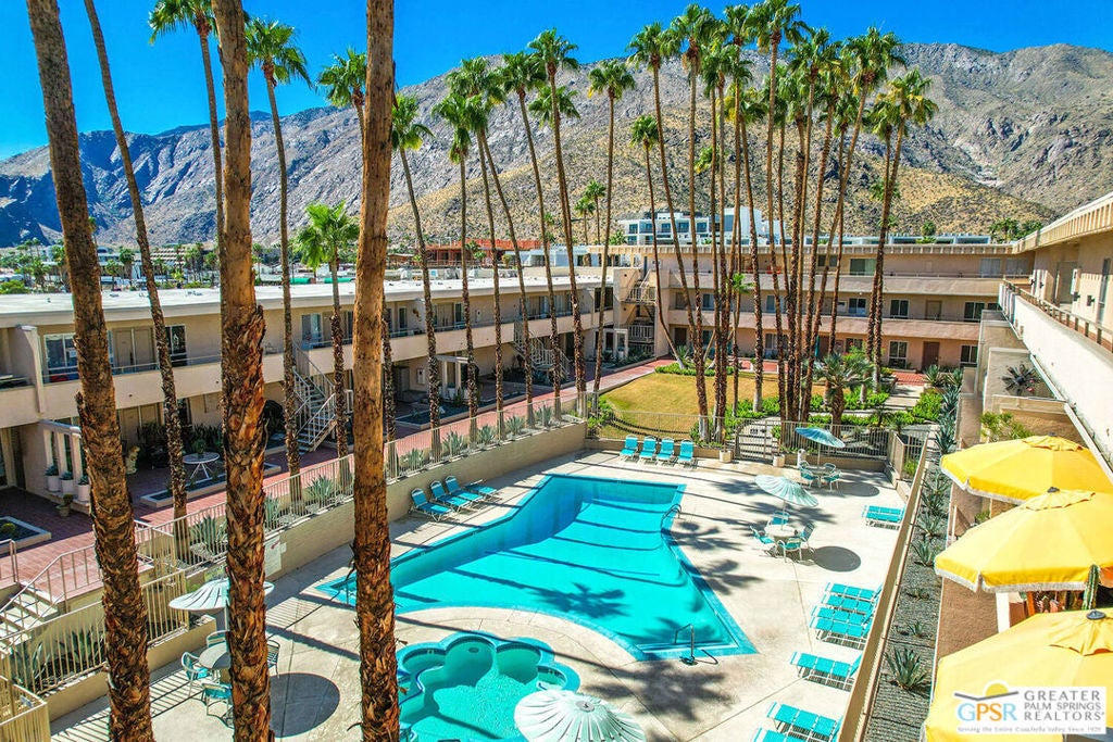 Discover timeless Palm Springs living in this beautifully updated condo at the iconic Mid-Century Villa Alejo, located just steps from the vibrant downtown strip. Originally built in 1966 to host Hollywood stars escaping Los Angeles, this historic community blends vintage charm with modern comfort. This 2-bedroom, 2-bath fully tiled residence features a large private primary bedroom overlooking the pool area and a well separated guest bedroom with its own bath. From your private patio, enjoy tranquil views of the lush courtyard, sparkling pool, and separate spa perfect for embracing the indoor-outdoor desert lifestyle Palm Springs is known for. This condo is available turnkey furnished (furnishings available outside of escrow). There is an in-unit washer and dryer and underground gated parking. Villa Alejo's amenities enhance the experience with a beautifully landscaped central courtyard, a community barbecue area, a well-equipped exercise room, and a stylish mid-century lobby ideal for welcoming guests. The monthly HOA fee covers electricity, water, trash, sewer, parking, earthquake insurance, and additional lockable storage in the garage. Conveniently located near downtown Palm Springs' restaurants, shopping, casino, and the popular Palm Springs Street Fair, this residence offers one of the best locations to enjoy the city's energetic and internationally renowned lifestyle. Villa Alejo isn't just a home it's a piece of Palm Springs history. Villa Alejo is on lease land with expiration in 2063. The current yearly lease amount is $4,361.