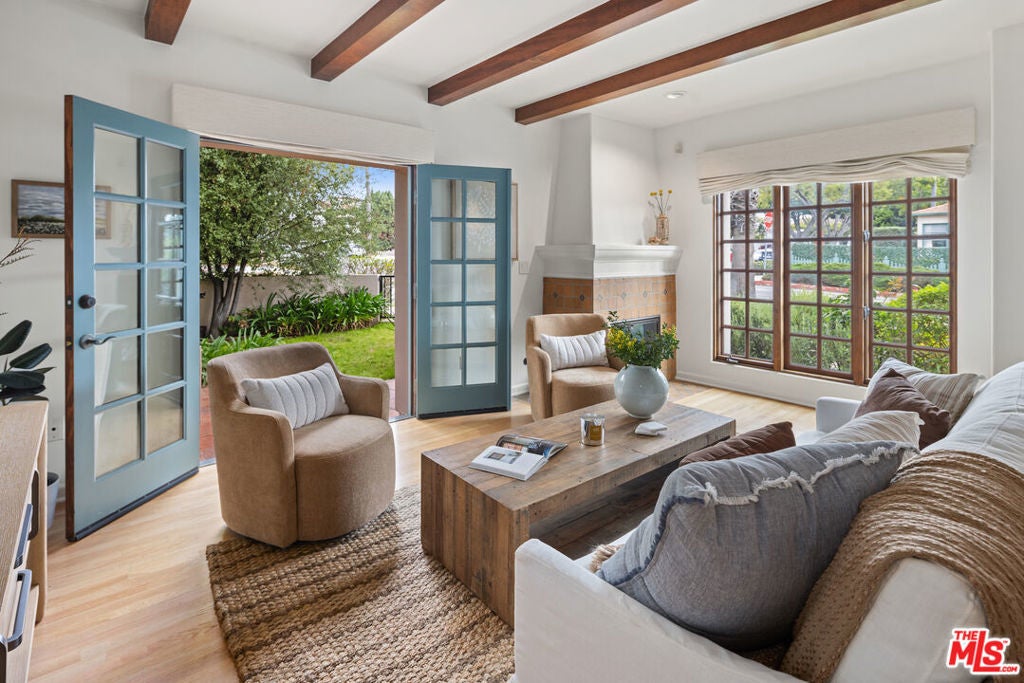 Located just blocks from Montana Avenue, this charming Spanish townhome offers the feel of a single-family home in one of Santa Monica's most coveted neighborhoods. With 2 bedrooms, 2.5 baths, and multiple flex spaces, this front-facing property is flooded with natural light and timeless character. The living room features exposed wood beams, a cozy fireplace, and French doors leading to a gated community yard, a hidden gem rarely used by others. The kitchen boasts a Viking stove and opens to the dining area, perfect for everyday living and entertaining. The dining room seamless integrates indoor, outdoor living with multiple French doors opening onto your own private patio and the community yard. Upstairs, the primary suite impresses with soaring vaulted ceilings, while the loft offers ideal space for a home office or creative nook. Also, upstairs you'll find a spacious second bedroom, full bathroom and side by side laundry. Enjoy the outdoors from two private rooftop decks, surrounded by greenery and treetop views. On the subterranean level you'll find a direct access private 2-car garage and a finished basement perfect for a gym, studio, or extra storage. Located in an intimate four-unit complex, this home blends charm, privacy, and function in a coveted North of Wilshire setting.