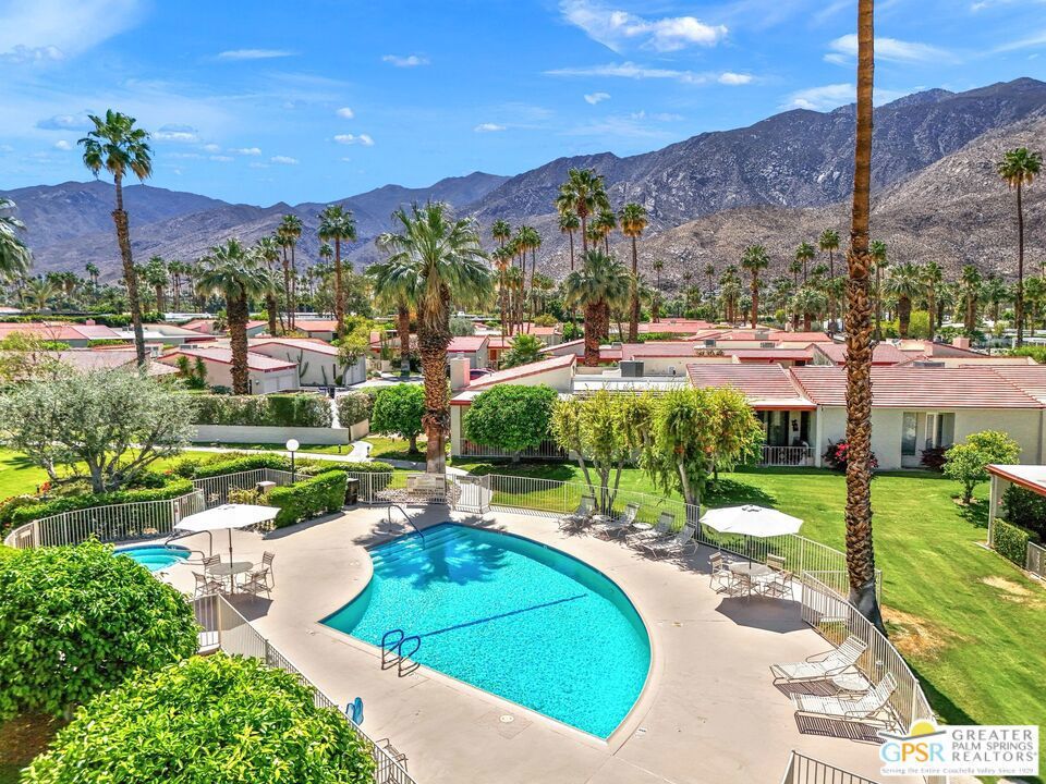 TUCKED AWAY in a quiet pocket of South Palm Springs, this UPDATED 2BD, 2BA with 1,325 SF delivers BEAUTIFULLY. Patios in both the front and back take full advantage of the ideal orientation. Canyon South 1 is a low-density HOA with just 68 homes set among beautifully maintained grounds. Mountain views work their MAGIC and the close proximity to resort-style pools is exactly how it should be. This truly is the perfect mix. Inside, the living, dining, and kitchen areas are defined yet flow effortlessly. You'll find vaulted ceilings, abundant natural light, and stylish finishes throughout. The en suite primary features a beautifully remodeled bath, dual vanities, and two closets with direct access to the patio as well. The guest bedroom with full bath is thoughtfully positioned on the opposite end of the home. A utility room with newer washer and dryer leads to the 1-car garage with a new door opener, and there's uncovered parking too. The long list of updates includes newer flooring, carpet, bathroom finishes, and interior doors. New HVAC system (2024). Just a short hop from Smoke Tree Village, ACE Hotel, Koffi, and Downtown Palm Springs. For walkers, joggers, and bikers, the neighborhoods in and around Twin Palms and Indian Canyons are especially popular. Lightly lived in and used part time, pride of ownership is clear throughout. The community features 3 pools and 3 spas. Enjoy it all.