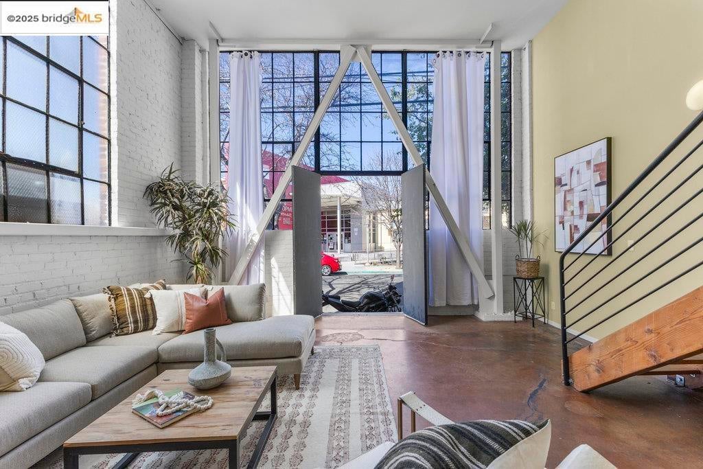 Rare Corner Unit in the Desirable East Lake Lofts! The best of Oakland’s industrial loft living in this rare corner unit at the coveted East Lake Loft community! It's an ultramodern live/work space in a charming, gated warehouse conversion fully renovated in 2006. This distinctive 1-bedroom, 1-bathroom home is perfectly positioned in the heart of the city, just steps from Lake Merritt, Laney College, shopping, and public transportation. Desirable secure building and gated 1 car parking! Entering, you are welcomed by a modern industrial aesthetic where contemporary style meets functional comfort. The spacious open-concept kitchen, living, and dining areas are flooded with natural light thanks to the unit's rare corner location and the two-story windows on two sides. The well-appointed kitchen is perfect for both casual dining and entertaining. A standout feature of this unit is the large, operable freight doors, seamlessly blending indoor and outdoor living while inviting fresh air, natural light, and the vibrant sights and sounds of the dynamic and sought-after community. The first floor includes a stylishly updated full bathroom with an in-unit laundry area for convenience. Elevated above the living space, a second-floor bedroom loft offers a private and tranquil retreat.