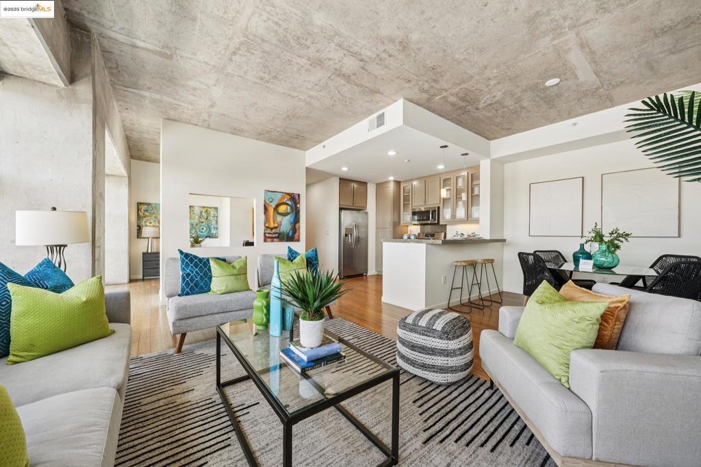 Discover the ease of life and exquisite modern aesthetic of Unit 822 at 428 Alice Street, in vibrant Jack London Square. This spacious 2-bedroom, 2-bathroom condominium spans 1,225 square feet and is designed for those who appreciate style and functionality. Step inside to be greeted by light-filled rooms adorned with beautiful flooring and freshly painted walls. The large kitchen is perfect for any home chef, featuring ample storage and modern finishes. Adjacent is the dining room and a living room great room, harmoniously divided by a pony wall to create a designated office space complete with built-in office furniture. Relax in the expansive bedrooms, where comfort meets elegance. Enjoy breathtaking urban views from the comfort of your home, and relish in the convenience of being close to all the attractions Jack London Square has to offer. Whether you're commuting or exploring, this location is unbeatable. For those seeking a blend of city life and serene living, this home is your haven.