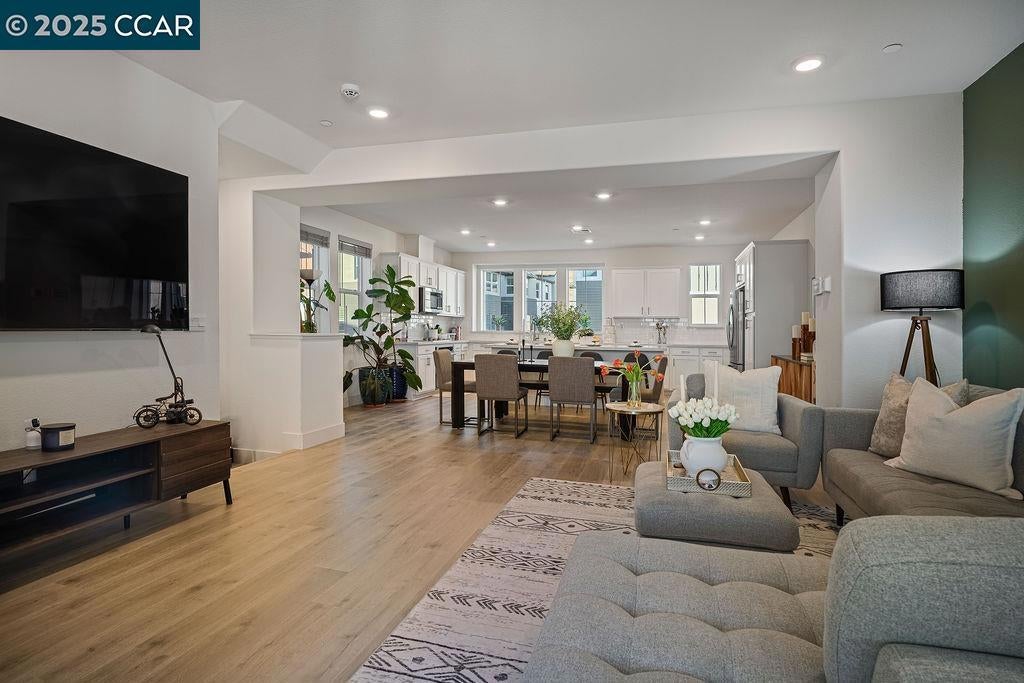 OPEN 9/6 & 9/7, 2PM-4PM! Modern living meets convenience at The Hideaway. This 4BR/3.5BA townhome offers 1,969 sq. ft. of bright, low-maintenance living with minimal shared walls and no backyard upkeep—ideal for today’s active lifestyle. The entry level features a private in-law suite with full bath, perfect for guests or multi-gen living. On the main level, the open-concept great room connects the kitchen, dining, and living areas, highlighted by large windows and a private balcony with views. The gourmet kitchen includes an oversized quartz island, stainless appliances, and ample storage. Upstairs, the primary suite offers a spa-like bath with dual sinks, walk-in shower, and spacious closet, plus two additional bedrooms and laundry. Upgrades include smart home features and paid solar. Community amenities include BBQ areas, bocce, walking trails, and a dog wash station. A private, low-maintenance lifestyle just minutes from BART, Cal State East Bay, and major freeways.