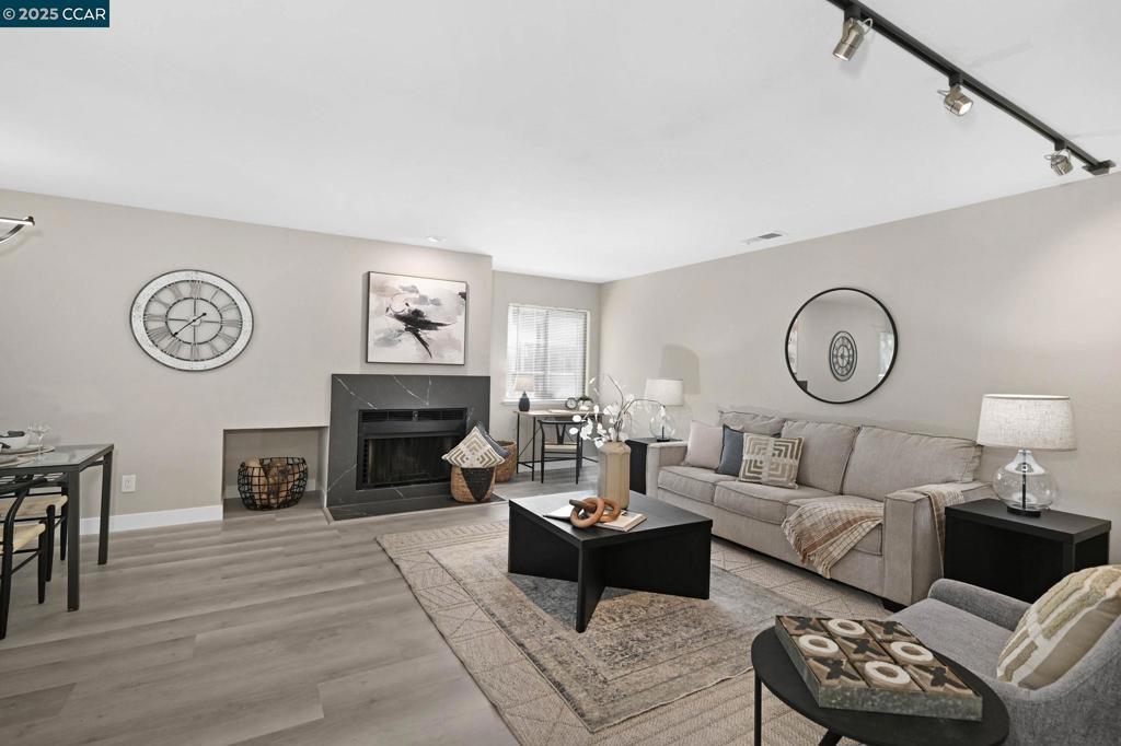 Beautiful Ground Floor, Corner Unit in a tranquil, wooded location. Remodeled throughout. Sharp, open kitchen with quartz countertops, white shaker cabinets and stainless-steel appliances including a gas range. Two remodeled bathrooms with quartz countertops. Large primary bedroom suite plus a second bedroom with full bath. Full sized laundry closet inside the unit. Spacious living room with cozy wood burning fireplace. Modern touches throughout, including LVP flooring, lighting and fixtures. Freshly painted. Pleasant views of green-belt and park. Large one-car garage with ample storage, plus assigned parking space. Wonderful, private backyard deck overlooking the trees and green belt. Convenient location with proximity to shopping, restaurants and easy commutes with Hwy 4 and I-680 nearby. Just across the street from Holiday Highlands Park.