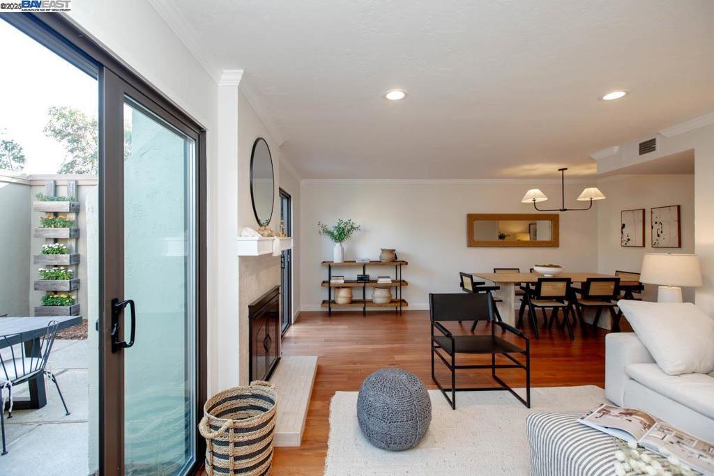 Located in Bay Farm Island's well-established Casitas HOA community, this attractively updated 2-story townhome is literally just minutes to highly ranked schools, Harbor Landing shopping (Safeway/Starbucks), the SF Bay trail and the SF Ferry for a unique and effortless commute into San Francisco. Unusually spacious at 1,628 square feet (per public records), the home features 4 bedrooms, 2.5 bathrooms, a living room/dining room combination, laundry room, an open kitchen/family room, a 2-car garage with custom storage cabinets, and a private patio/garden. Features include crown moulding, dual-pane windows, a fireplace, engineered hardwood floors on the main level, and new light fixtures and a freshly painted interior throughout (both 2025). The kitchen and bathrooms were updated with attractive, timeless finishes and materials. The large primary bedroom has an ensuite divided bathroom plus sliding doors that open to a Juliet balcony and provide a view of the common area's well-maintained and attractive landscaping and pathways. All bedrooms have nearly new carpeting (2021), and closets with custom organizers for plenty of storage. HOA amenities include a community pool, clubhouse, and playground. Enjoy resort-like living from this move-in-ready home in a desirable Bay Farm Island