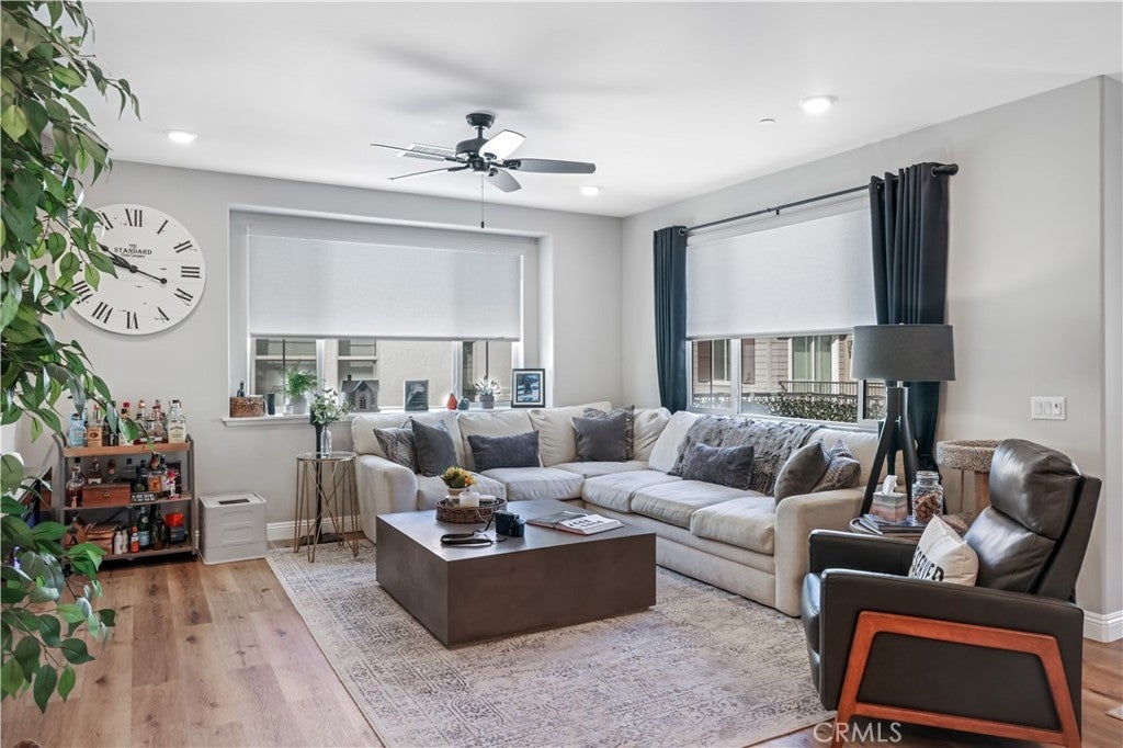 Welcome to your move-in ready home in the desirable Shady Trails community! This beautifully upgraded 2-bed, 2-bath condo offers 1,311 sq ft of modern comfort and style. The open-concept kitchen features GE stainless-steel appliances, a Samsung refrigerator (included), tile backsplash with metal framing, pendant lighting, and elegant dark-gray quartz counters that continue into both bathrooms. Upgraded waterproof laminate flooring runs throughout, complemented by recessed lighting and custom blinds that allow in natural light while maintaining privacy. The spacious primary suite includes a sliding barn door leading to the ensuite bath and a Hunter ceiling fan with remote. Smart features include app-controlled lighting in key rooms, a Ring doorbell, Wi-Fi extenders, and a MyQ smart-garage system with built-in camera. Additional highlights include epoxy-coated garage flooring, upgraded black hardware, keyless front entry, and abundant storage with dual kitchen pantries and attic access. Enjoy your private balcony with full-perimeter privacy screening and plantation-style shutters. Refrigerator, stackable washer and dryer, and all ceiling fans are included. Condo is equipped with solar through Sun Strong Management under a lease of $75.26 per month. Buyer to assume solar lease at the close of escrow. This home combines thoughtful upgrades, energy-efficient features, and modern convenience—all within a vibrant gated community near parks, shops, and freeway access.