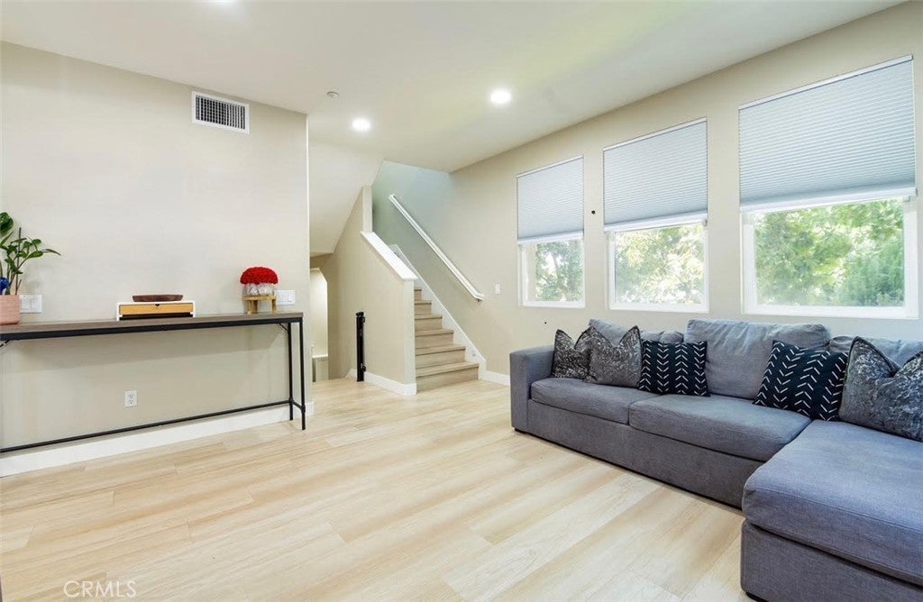 This stunning three-story home in Willow Walk Community offers a secure living environment with an inviting entryway leading to a spacious second floor featuring an open living room, half bath, dining room, and modern kitchen with granite countertops and wooden cabinetry. The home includes a serene patio with an anti-theft sliding door, while the third floor boast a master bedroom with an in-suite bathroom, an additional bedroom, and a full bathroom. Renovated with upgrades like new flooring, LED vanity mirrors, recessed lighting, custom windows screens in entry, and security features, it also includes an attached two-car garage and various negotiable amenities like a Tesla charger and water filtration system. Residents can enjoy a common dog park and playground, with 24/7 security access, making this home a perfect blend of comfort and safety.