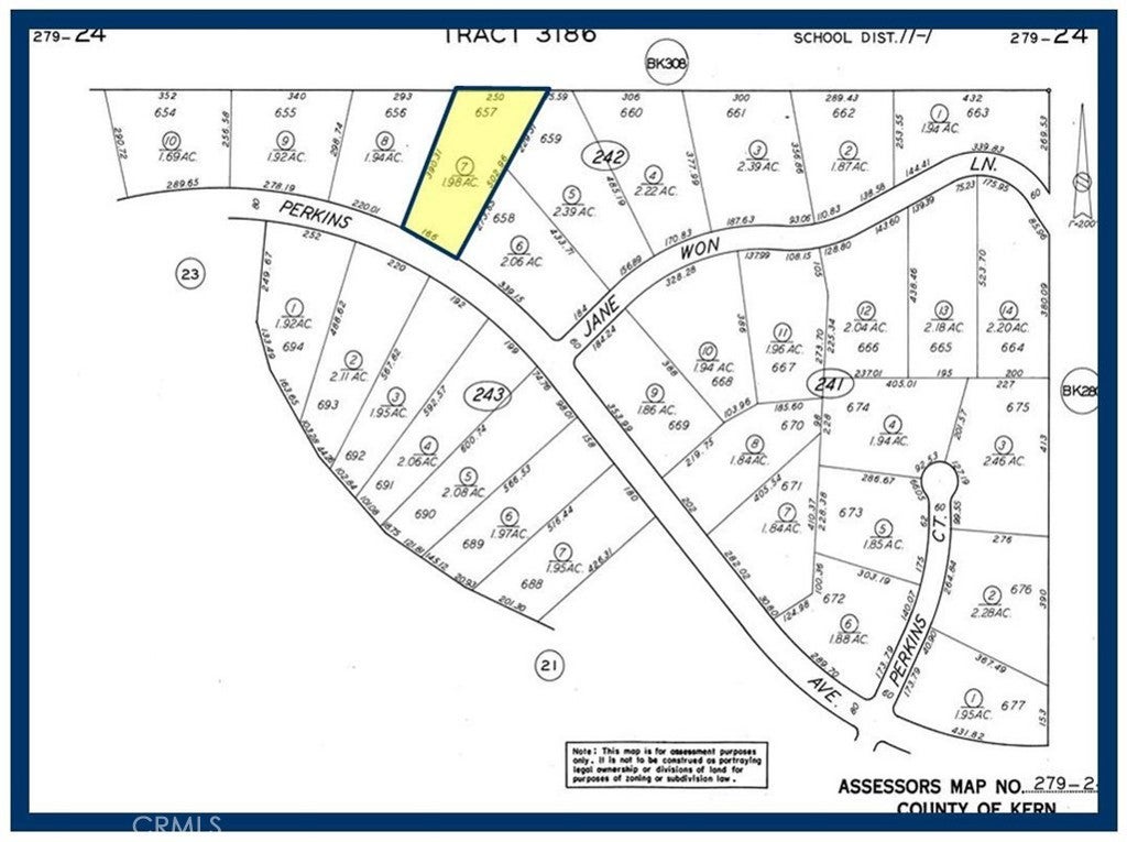 Lot 657 Map 3186, 1.98 Acres, (Apn: 279-242-07-007) GPS: 35.21294, -117.79658 on Perkins Ave in California City, CA. California City is in northern Antelope Valley in Kern County. California City is 18 miles northwest of Edwards Air Force Base, 40 miles north of Lancaster and 28 miles east of Tehachapi. California City has zoned this property as R4 Residential. According to the City the following uses are permitted: Single Family Dwellings, riding stables, corrals and animal keeping. No utilities are currently available to this lot. Electricity is aprox 1.2 miles east. Please check with the City for water and sewer distance. Use the GPS coordinates to locate the property. GPS: 35.21294, -117.79658