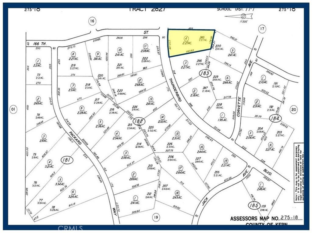 Lot 245 Map 2827, 2.27 Acres, (APN: 275-183-04-000) GPS: 35.19511, -117.83383 on Thunderbird Blvd in California City, CA. California City is in northern Antelope Valley in Kern County. California City is 18 miles northwest of Edwards Air Force Base, 40 miles north of Lancaster and 28 miles east of Tehachapi. Silver Saddle is a 120 acre resort. The resort has a large Koi pond, fitness center, pools and RV park. California City has zoned this property as R4 Residential. According to the City the following uses are permitted: Single Family Dwellings, riding stables, corrals and animal keeping. No utilities are currently available to this lot. Electricity is approx. 1.4 miles northwest. Please check with the City for water and sewer distance. Use the GPS coordinates to locate the property. GPS:35.19511,-117.83383