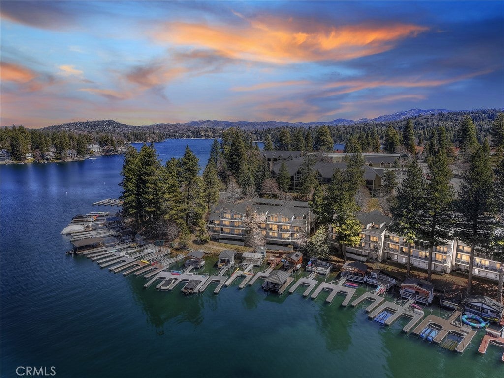 Enjoy lake side living with no units or homes between your patio and the lake's edge. You're so close to the water, you could literally toss a beachball off of your private deck and into the lake. This remodeled level entry condo offers the true feeling of the ultimate "Mountain Lake" lifestyle. Featuring 2 spacious bedrooms and 2-baths, an expansive entertaining deck with big, bold lakeviews with access from the living room and the primary bedroom. Ideally situated next to the Lake Arrowhead Resort and just steps from the Lake Arrowhead Village where you'll enjoy shopping, dining and entertainment. You'll own your own dock slip which is included in the list price and easily available for financing with your purchase, if desired. Access to the dock is just a few yards away at the end of the cul-de-sac. Inside, you’ll find an open floorplan with gorgeous wood flooring, recessed lighting, and thoughtful built-ins. The living and dining areas flow into an upgraded kitchen featuring smooth countertops, a breakfast bar, and premium appliances. The living room with cathedral ceilings, fireplace and sliders out to the deck is light-filled and so comfortable. The primary bedroom on the main floor also captures the afternoon sunlight along with providing a close and up front view of the sunsets over the lake. (Lake Arrowhead is a private lake and only homeowners or landowners and their guests have access to boating, three private beach clubs and the trails around the lake.) The private laundry area includes a washer and dryer for added convenience. With level entry and an attached garage with additional covered parking and guest parking, accessibility and comfort are top priorities. Located in a gated community, residents enjoy exclusive access to a private beach at the Lake Arrowhead Resort adjacent to the development. Whether you're relaxing on your balcony, entertaining indoors, or heading out on the water, this home blends modern luxury with the natural beauty of the lake. Offered turn-key furnished with designer decor, this rare lake side property is ready to enjoy immediately—perfect as a weekend getaway or full-time escape. This is truly the definition of living in the "Heart Of Lake Arrowhead".