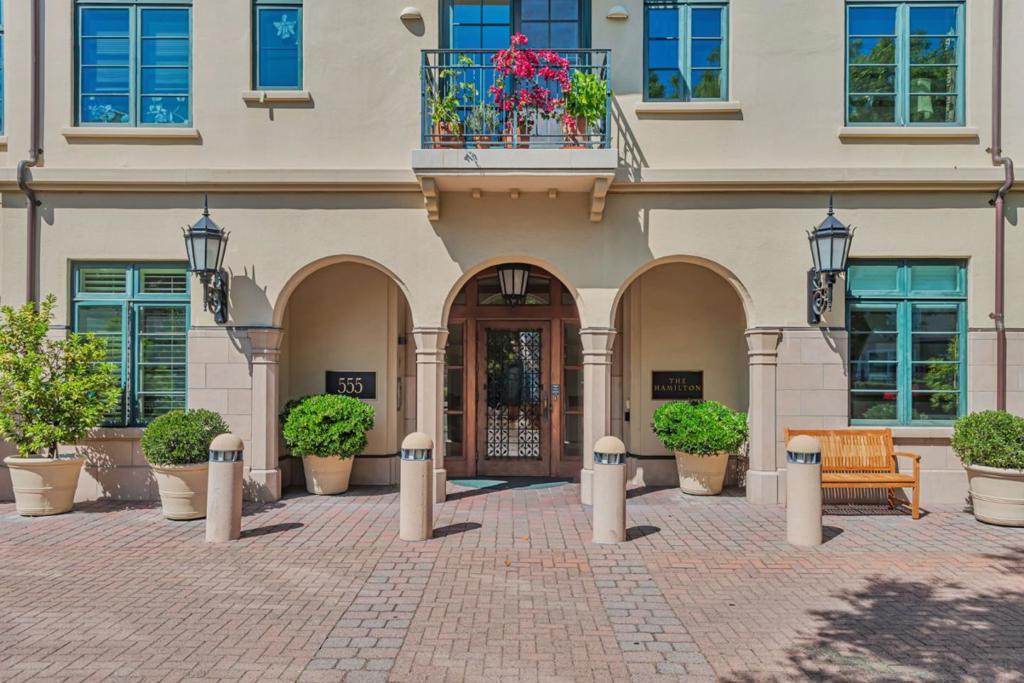 Discover refined living in this elegant 2-bedroom plus den/study, 2-bath ground-floor residence with easy access at The Hamilton, a premier 55+ community in downtown Palo Alto. Thoughtfully updated with brand-new flooring, fresh paint, energy-efficient LED lighting throughout, this home offers a bright and welcoming ambiance. Enjoy seamless indoor-outdoor living with private patio opening to a garden surrounded by patio walls, ideal for planting spring flowers or relaxing in serenity. The open-concept layout boasts high 10-foot ceilings with crown molding and abundant natural light. Additional bedroom and den/study provide flexibility for guests, a home office, or hobbies, while an in-unit laundry nook adds convenience. Opportunity for buyer to increase market value by turning den/study to full bedroom. The Hamilton elevates your lifestyle with exceptional amenities: a full-service dining room offering chef-prepared three-course meals nightly, a heated indoor pool, a jacuzzi, a spa-like fitness center, a library, and a 24/7 concierge. Nestled in vibrant downtown Palo Alto, enjoy top-tier dining at Tamarine or Ettan, coffee at Blue Bottle, boutique shopping on University Avenue, and classic films at the historic Stanford Theatre, a perfect blend of luxury and culture.