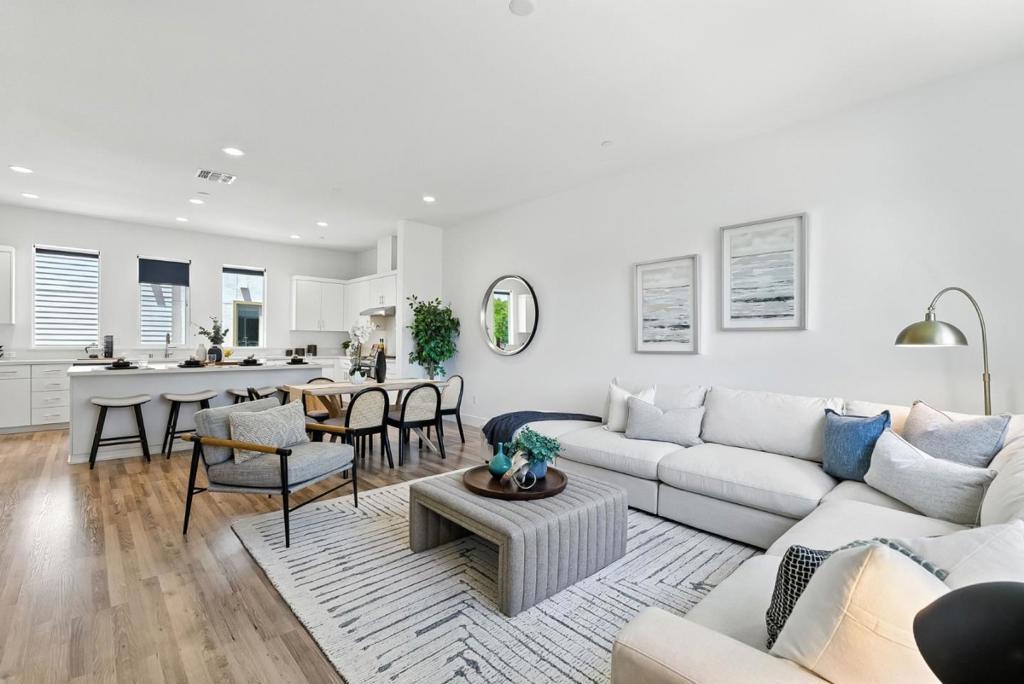 Townhouse-style. This tri-level home exudes modern elegance, featuring an expansive open-concept living and dining area with soaring 10-foot ceilings and wide-plank luxury flooring throughout. Natural light pours in through multiple windows, highlighting the stunning entertainer's kitchen complete with crisp white cabinetry, quartz countertops, a spacious center island, and sleek stainless steel appliances. Upstairs, both generously sized bedroom suites offer ensuite baths and privacy, ideal for dual owners or guests. Enjoy high-end finishes, updated bathrooms, walk-in closets, and energy-efficient dual-pane windows for year-round comfort. A show-stopping rooftop deck crowns this home, offering a private outdoor oasis to soak in sweeping views of the Dublin Hills perfect for sunrises with your morning coffee or colorful evening skies. Additional features include a freshly painted interior, new carpet, an attached two-car garage with EV charger, and access to an award-winning BIA community featuring striking modern architecture and creative landscaping. Just minutes to BART, 580/680, top-rated parks, shops, and Dublin's most charming playgrounds. This home brings elevated East Bay living to your doorstep. Motivated Seller, Make an offer!