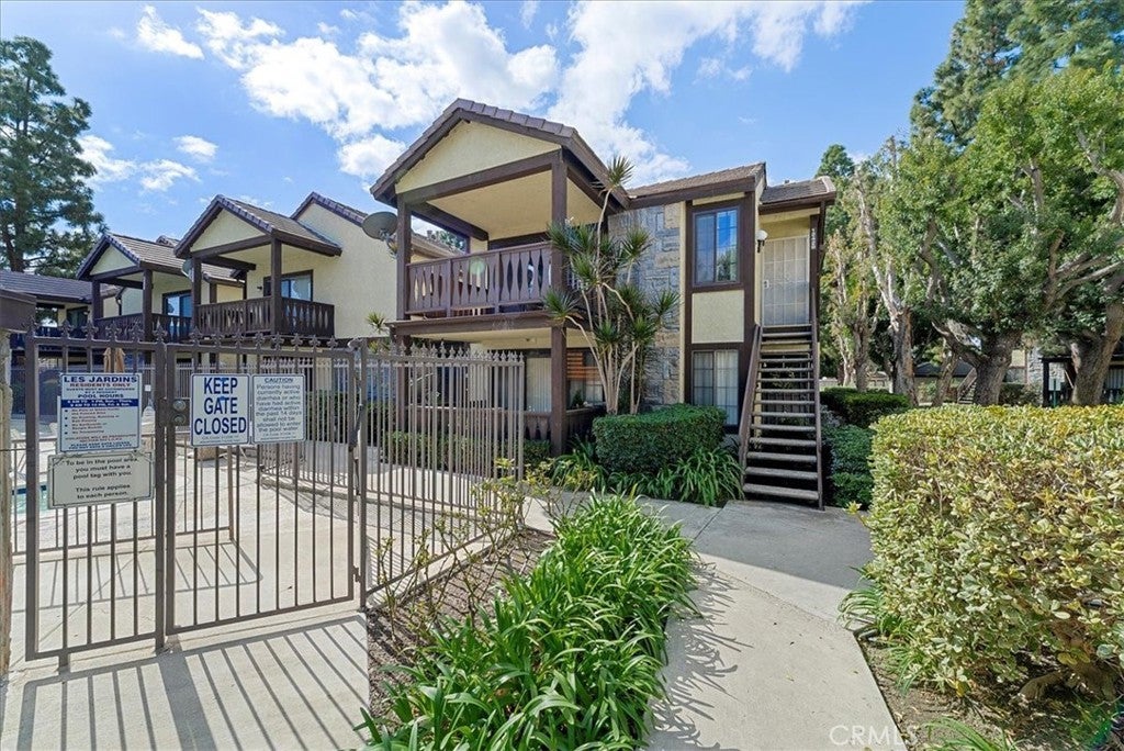 Location, Location, Location! with a full size, private TWO CAR GARAGE and CENTRAL A/C. Welcome to the beautiful community of Les Jardins in Orange County. The charming grounds are professionally landscaped with a resort like ambiance. Babbling brooks and peaceful paths scale throughout the heart of the community. This fantastic END UNIT has marvelous views from an extra large covered patio that overlooks a private pool and spa area. It is just moments away from your front door so you can enjoy a relaxing spa or swim session. There is also an additional larger pool area, posed in a beautiful resort like setting to lounge in. As for the interior, there is an entry way leading to an expansive living room area. You'll immediately notice scraped ceilings and easy to maintain warm toned wood laminate. Enjoy a darling galley style kitchen offering a dishwasher, refrigerator, gas range oven/stove, upgraded lighting and a reverse osmosis filtration system. The bathroom offers a full size bathtub with shower and has been upgraded with a new vanity and granite counter top. The hall closet houses plenty of storage shelving above a full size washer and dryer. The primary bedroom has abundant natural light, a walk-in closet with additional attic storage access, is spacious enough for multiple dressers and can accommodate a King size bed. The windows have been upgraded to dual pane. Les Jardins community is centrally located and has easy access to several freeways such as the 5, 22, 405, 55 and 57. Public transportation is also nearby. The community has remote security gates to enter.
