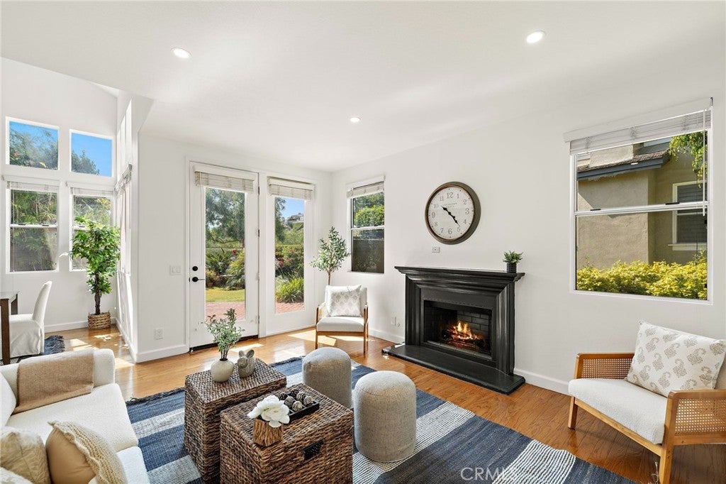 As you enter, warm natural light floods the space through tall windows and soaring ceilings, highlighting the freshly buffed hardwood floors and crisp new paint throughout. A statement chandelier adds elegance to the formal dining room, while the inviting living area is anchored by a cozy fireplace and opens to your own quaint, landscaped patio and yard — a lush and private space ideal for morning coffee, weekend barbecues, or unwinding after a beach day.
