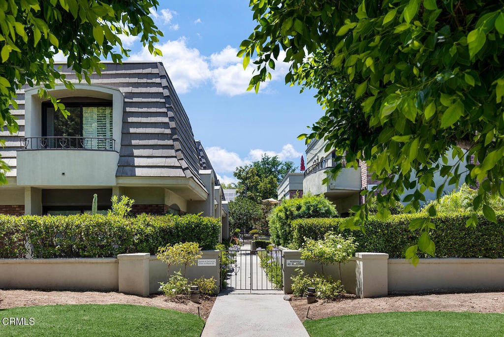 Situated in one of the most sought-after condominium communities along Pasadena's prestigious Millionaires' Row, this ground-floor residence is one of only 14 units in the complex. The home features soaring ceilings, an open floor plan, and expansive sliding glass doors that seamlessly connect the interior to an impressive wraparound patio of over 1,000 square feet. Designed for both relaxation and entertaining, the patio is enhanced with stone pavers, a lush green backdrop, abundant seating areas, and an outdoor fireplace, creating a private retreat ideal for entertaining or quiet relaxation. Inside, the spacious layout offers two generous bedroom suites plus a versatile den with custom floor-to-ceiling built-in shelves and cabinetry, perfect as a study, library, or optional third bedroom. Thoughtful details include hardwood floors, crown molding, plantation shutters, a living room fireplace, and extensive built-in bookshelves. Community amenities include a sparkling pool and spa conveniently located near the unit. Additional highlights are a gated garage with elevator access, assigned side-by-side parking, a large private storage closet in the garage, an exterior utility closet on the patio, and an in-unit laundry room. HOA fees include trash, common area maintenance, pool and spa, roof, water, and earthquake insurance.