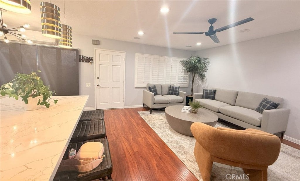 introducing this beautifully upgraded two-story townhome in the desirable Boardwalk Village community of Cerritos. Featuring 3 bedrooms, 2.5 bathrooms, and approximately 1,145 square feet of thoughtfully designed living space, this home offers modern style and comfortable functionality. The spacious open-concept main level showcases sleek laminate flooring, recessed lighting, and a bright living area with custom window shutters and roller shades for added privacy. The updated kitchen is the heart of the home, boasting white cabinetry, quartz countertops, a center island, and a cozy breakfast nook perfect for everyday dining. Upstairs, you'll find all three bedrooms, including a well-sized primary suite with a walk-in closet and two additional full bathrooms. The property also includes a surround sound wall system, central cooling, and a private outdoor patio area. Enjoy the convenience of a dedicated garage and an additional parking space. The low monthly HOA covers water, gas, trash, and landscaping—an incredible value. Boardwalk Village offers resort-style amenities including a pool, spa, and clubhouse for gatherings. Ideally located near Cerritos Mall, schools, shopping, dining, and with quick access to the 91 and 605 freeways, this is a rare opportunity to own in a peaceful and well-maintained community.
