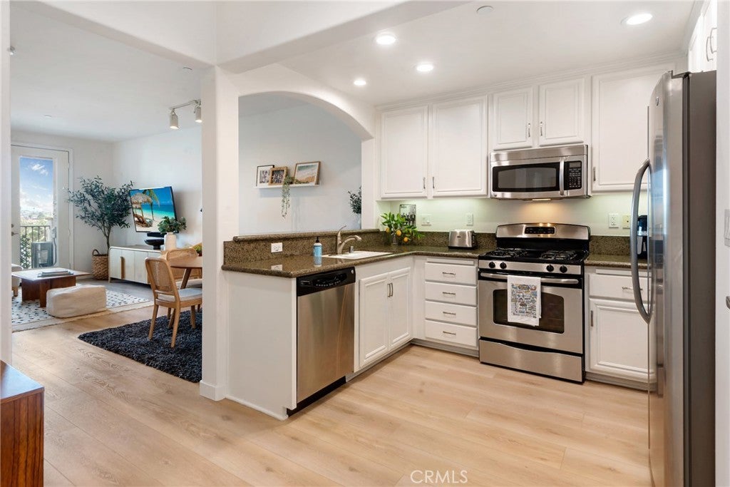 New price on this fantastic top floor city view condo. Welcome home to this top-floor one-bedroom + office/den in the beautiful 55+ complex of The Montecito. Located just 1.7 miles from the beach, The Montecito consists of only 48 single-level condos, and top-floor units are rarely available. Although one resident must be 55+, buyers of any age can own a unit in the community. This turnkey home has been impeccably maintained and beautifully upgraded. Enter into the open concept floor plan that gives a feeling of space much larger than the square footage would indicate. Flooded with natural light, the interior spaces are warm and inviting, featuring beautiful Nexxa-Core wide plank luxury vinyl flooring and a neutral color palette. The entertainer's kitchen opens to the dining and living areas and features granite countertops, stainless steel appliances, sleek white cabinetry, and recessed lighting. The large dining and living areas offer a tranquil retreat with city light views, and the home features both central heat and A/C. Head out the double French doors to the private south-facing covered balcony to enjoy beautiful sunrises and sunsets, beach breezes, and a view of Palos Verdes in the distance. The spacious south-facing bedroom offers excellent natural light and features high ceilings, a ceiling fan, and an upgraded walk-in closet with built-ins. In addition to the primary suite, the thoughtful layout features a separate and spacious room off the kitchen that could be readily utilized as a den, office, formal dining room, and even large enough as a guest room, and features custom cabinetry from California Closets. For total convenience the condo offers in-unit stackable laundry located just off of the bedroom. The Montecito provides a friendly atmosphere with elevator access to all levels, a peaceful courtyard, a community room, and each level features an outdoor fireplace and seating area. The community allows two pets and is a non-smoking building. The condo comes with one designated parking spot in the gated garage along with storage. The location is ideal and central to everything the South Bay has to offer. The beach, The Point in El Segundo, downtown Hermosa and Manhattan are all within a few miles.