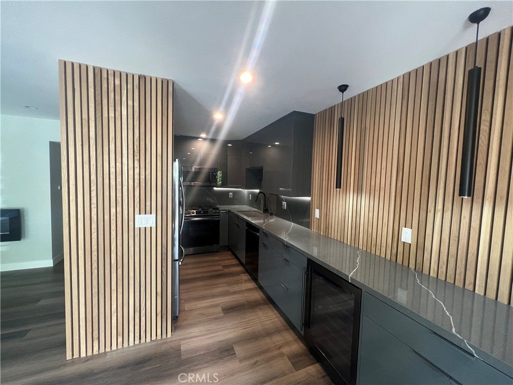 Stunning, renovated 2 BR 2 BA unit in Sherman Oaks. Remodeled kitchen includes newer custom cabinets, counters, and appliances (including wine refrigerator). Kitchen opens to dining area and spacious living room with electric fireplace and sliding door to balcony. Two en-suite rooms feature custom closets and baths with designer tilework. Completed with modern accents such as custom doors and woodwork and designer lighting. Located with convenient access to the 101, 405, Sepulveda Blvd., and in close proximity to the Sherman Oaks Galleria.